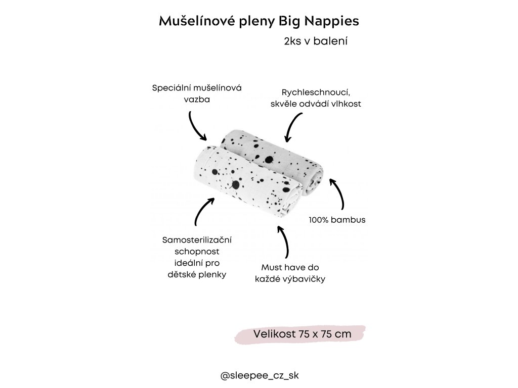 Balení dvou kusů bambusových mušelínových plen Sleepee Big Nappies šedá/růžová doporučujeme jako součást výbavičky pro miminko. Plenky využijete po celý rok jako zavinovačku, dětskou podložku, přikrývku, jako pomocníka při kojení a v mnoha dalších každodenních situacích.