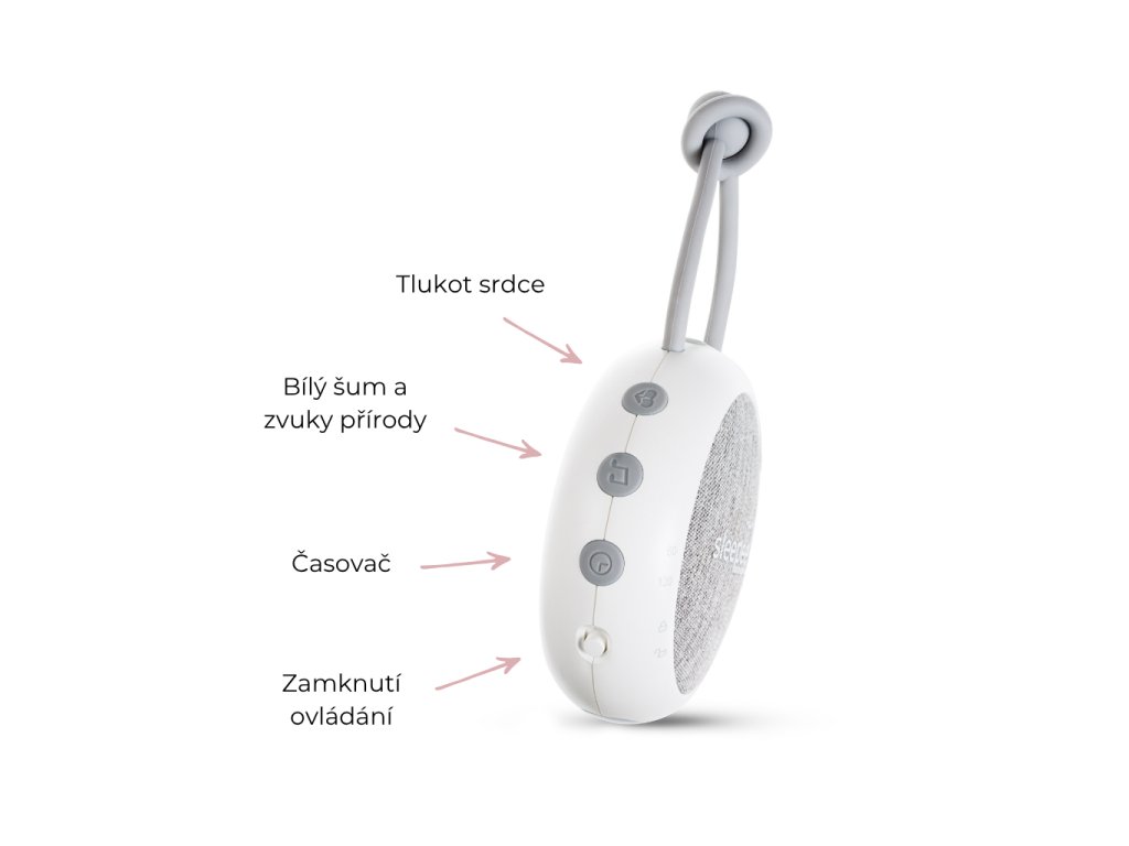 - Přenosný zvukový modul přehrávající bílý šum, tlukot srdce a zvuky deště a přírody pro klidné uspávání.