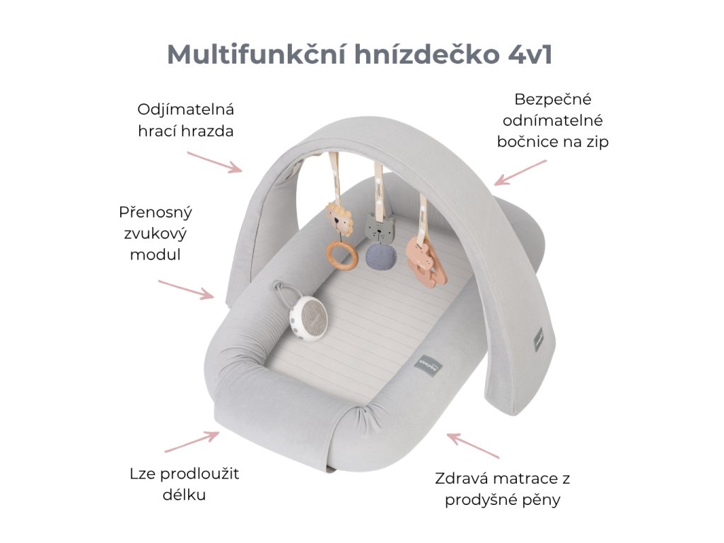 Inovativní řešení 4v1 kombinuje bezpečnost, pohodlí a klidný spánek v jedné sadě. Hnízdečko roste s vaším miminkem a přizpůsobuje se vašemu dennímu režimu - od spánku přes hraní, až po klidné chvíle odpočinku.