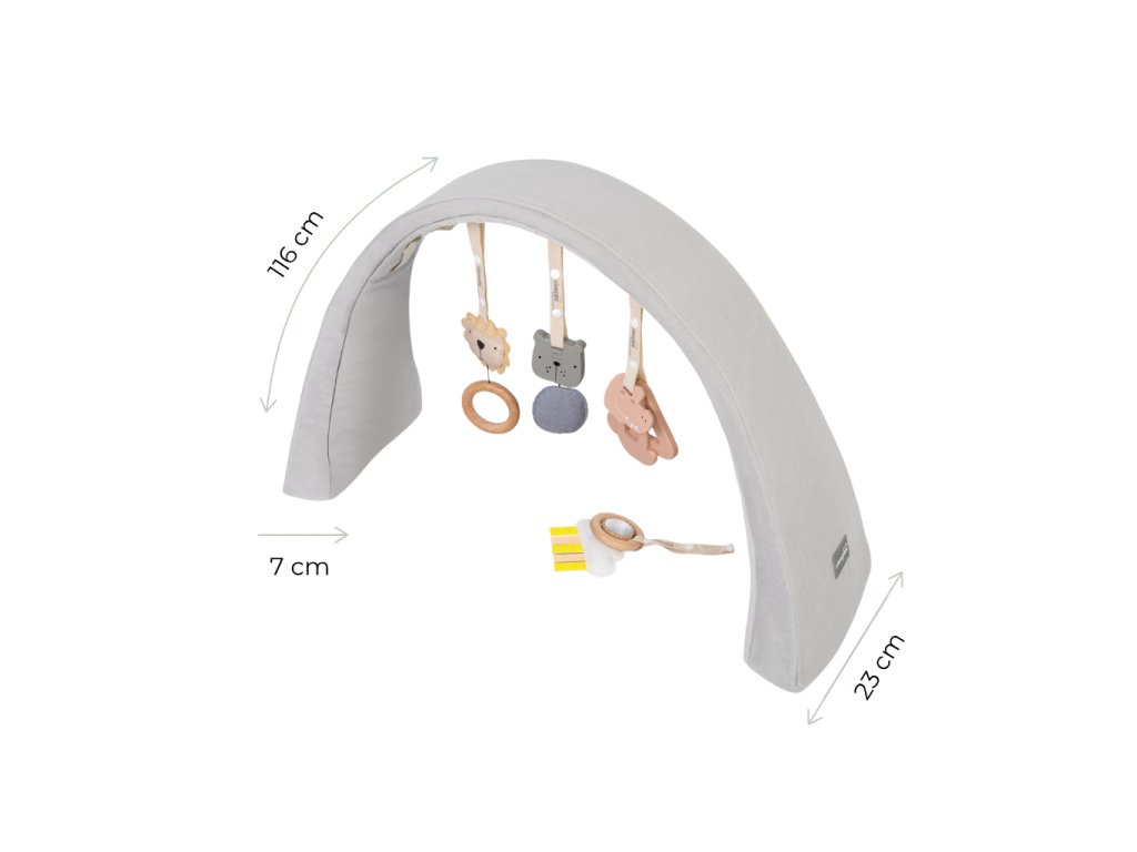 Hrací hrazdička pro miminko obsahuje 4 hračky z kvalitních nezávadných materiálů - se zrcátkem, kousátkem, chrastítkem a dalšími senzorickými prvky.