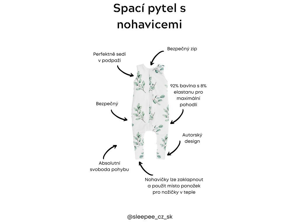 Nohavice mají zakončení stejné, jako u některých dětských bodyček a overalů - okraji nohavic tak můžete jednoduše překrýt nožky dítěte a zajistit jim ještě větší teplo. Nohavičky můžete překrýt až v průběhu spánku podle toho, zda je dítěti teplo nebo zima.